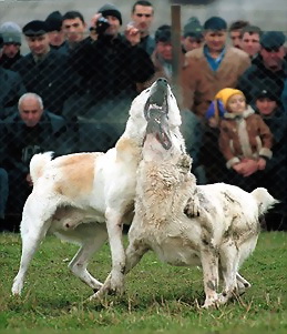 The Russian dog fights usually involve massive, thick-headed Russian wolf-killers, like the famous Caucasian Mountain dog, and the Central Asian Shepherd. The All-Russian Association of Volkodavs (wolf-killers), which unites more than 1,000 owners of Russian fighting dogs, even sponsors a "national fighting championship" and holds its tournaments almost openly.