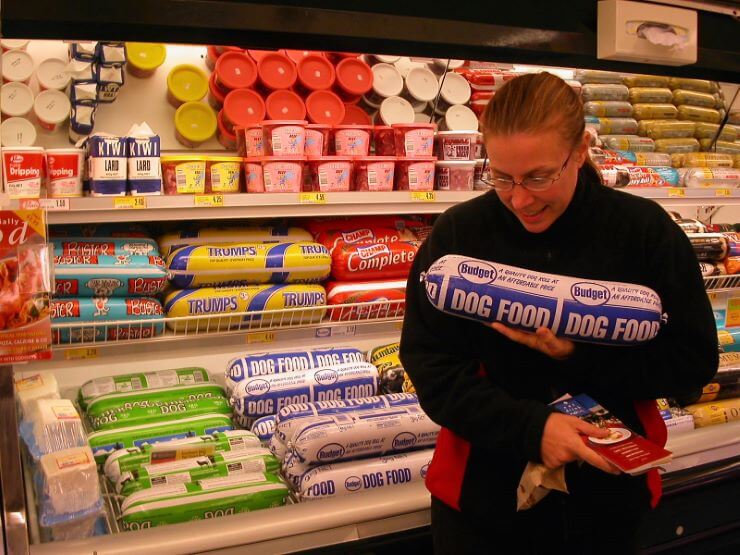 A buyer of sheap low-protein dog food in a supermarket