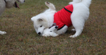 Samoyed and Pomeranian difference. Both dogs are both in the Spitz family, close relatives,