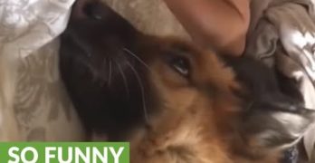 A mighty guard dog Caucasian Shepherd brings a little girl to safety after watching her go underwater in the sea.