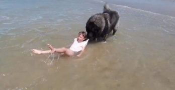 A mighty guard dog Caucasian Shepherd brings a little girl to safety after watching her go underwater in the sea.