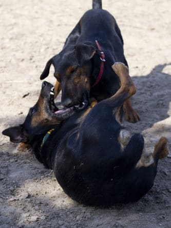 If the overexuberant behavior continues, play can be getting out of hand. If this is the case, simply interrupt play when you think your dogs have become too rowdy or vocal. After you’ve interrupted the play session, you have a number of options. You can use a time out, putting them in separate areas for 5 minutes so that they can cool down, and then let them play again. You can also take them for a leash walk instead of a time out. This helps expend some of their pent-up energy. Both of these methods can prevent a fight.