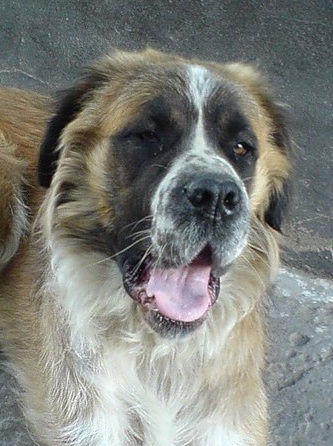 The Moscow Watchdog is a Russian dog breed, developed in the Soviet Union after WWII. This Soviet dog is very large and heavy, it has a massive, usually black-masked head, and a muscular, powerful body, covered in a thick, medium-length double coat of mostly white color with red, orange, or brown patches.
